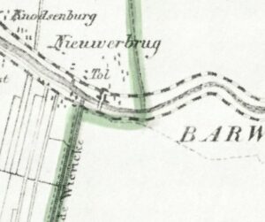 Waarder (onder). De meest kenmerkende constructies van Nieuwerbrug – de tolbrug, de Onafhankelijkheidstoren en de Brugkerk – werden gebouwd in het Waarderse deel van het dorp. De grenzen waren het Barwoutswaarderse deel, de Oude Rijn en de Dubbele Wiericke.
