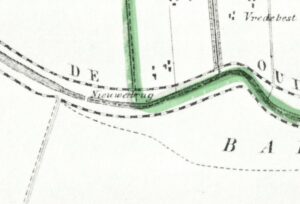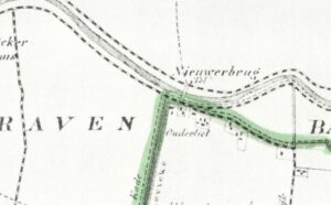Barwoutswaarder (onder). Het Barwoutswaarderse deel van Nieuwerbrug stak als een taartpunt in het Waarderse deel en werd begrensd door de Oude Rijn en de Korte Waarder. De westgrens, de punt, liep tot en met wat nu Hoge Rijndijk 6 is.